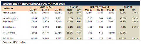 Most of the Auto firms in India had a disappointing March quarter on the back of subdued demand; high fuel prices, higher insurance costs and liquidity squeeze in the economy. The increased ownership cost in addition to stress at the farm level hampered buying sentiment, particularly in 2Ws/PVs segment. Consequently, inventories were at record levels across segments and particularly it was highest in the two-wheeler segment at 60-70 days. Almost all auto companies are facing the issues of high inventory levels across the country, that has forced auto companies to cut production, companies which have cut down on production include big names such as Maruti Suzuki, Bajaj Auto, and Hero Motors. This slow down is directly reflected in auto sector earnings, which have seen sharp declines in profits across the board. Bellwether companies such as Hero Moto Corp, TVS Motor have been worst hit in terms of profitability.