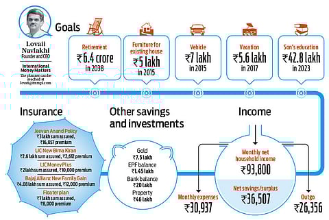 Pune-based 34-year old Girish Sonar is in a position to achieve all his financial goals if he starts acting on them right away. Along with wife Prajakata who is expecting a second child soon, son Om and mother Sunanda, the family resides in their own home in Pune. Girish works as an assistant software consultant and the family lives very much within its means, with the propensity to save a significant portion of what Girish earns and his mother receives as pension. Like several Indian families, real estate forms a significant part of their assets with two plots, a house that is let out in their home town and the house where they reside. However, what can harm his and the family's future is the fact that he has plenty of idle cash in his bank, which is not being meaningfully deployed. They have also borrowed more money than they need to. For instance, they have investments in gold worth Rs. 7.5 Lakh, but nearly half of it is mortgaged. He also has a couple of soft loans from relatives. He has an outstanding home loan of Rs. 24 lakh, a gold loan of Rs. 2.6 Lakh and a soft loan of Rs. 3.3 Lakh. Servicing loans can be expensive, especially when he sits on a bank balance of Rs. 20 Lakh, which could be better deployed to reduce his liabilities.