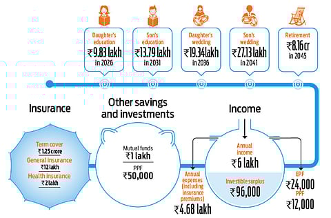 Education costs are spiralling every year. Planning early for children’s education will ensure that you do not have to compromise on this front when the actual need arises. To give a fair idea of Amit’s financial goals, the Rs.5 lakh requirement for education now will become approximately Rs.9.83 lakh in 2026 for his daughter and approximately Rs.13.79 lakh in 2031 for his son. This is assuming an inflation rate of 7 per cent annually. To fund this, Amit would need to earmark Rs.3,500 every month for his daughter and Rs.2,000 every month for his son. This is assuming a growth of about 14 per cent annually.