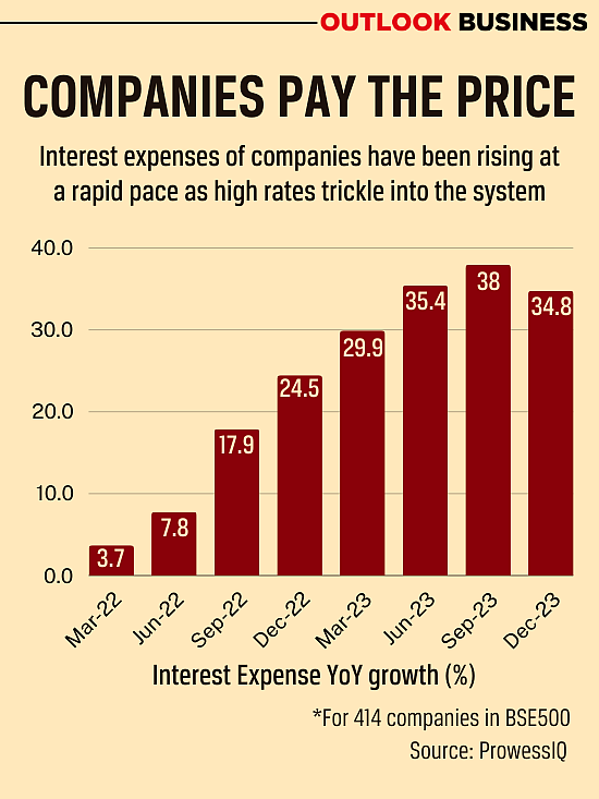 Indian companies will not be happy with interest rates staying high. An analysis of 414 companies in the BSE500 index using Prowess IQ data showed that interest expenses of the companies have surged in the last few quarters. From just three per cent year-on-year growth in aggregate interest expenses in the last quarter of the 2022 financial year, interest expenditure went up to 34.7 per cent in the third quarter of the 2024 financial year.