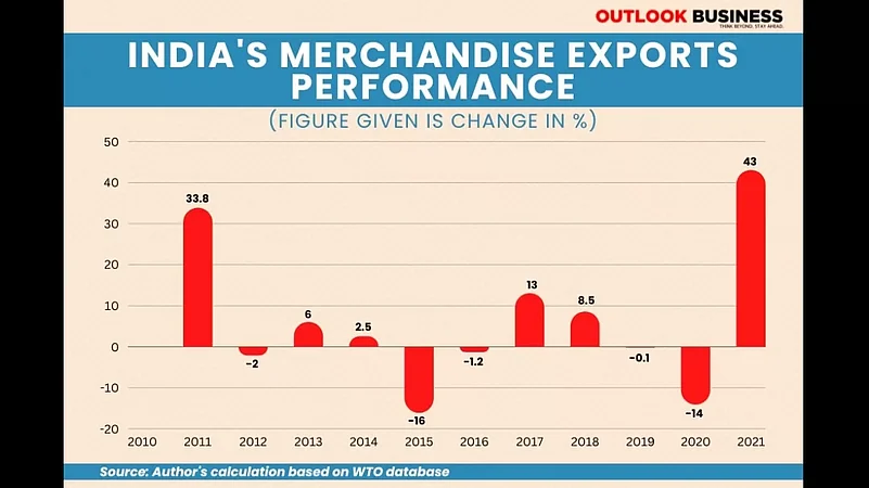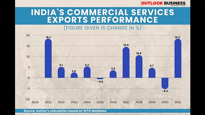 During the given period, merchandise exports contracted five times whereas services exports witnessed de-growth only two times. The World Trade Organisation (WTO) figures also reveal that the annual average growth of services exports during the 2010-21 period has been 7 per cent as against the 5 per cent growth shown by the merchandise exports sector.