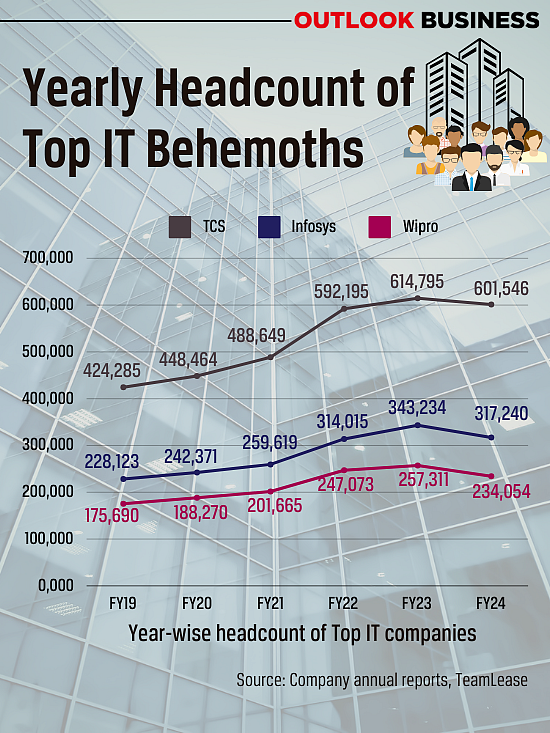 Data compiled by TeamLease, a Bengaluru-based recruitment services company, shows that the three IT giants—Wipro, Infosys and TCS—saw a 5.4 per cent drop in average headcount in the last fiscal. While it is true that geopolitical concerns such as the crisis in West Asia and the Russia-Ukraine war have weighed on businesses across sectors, the IT industry’s pessimism has been compounded by the outlook for AI.