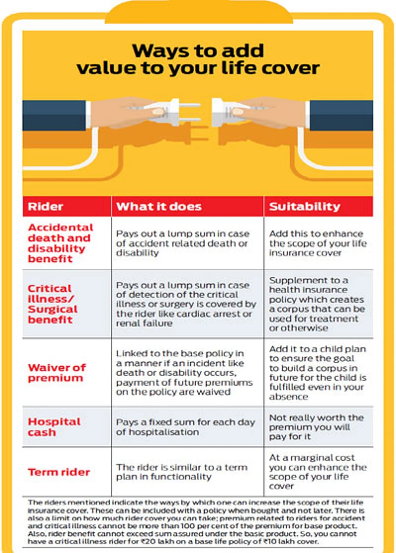 Like the pizza comes with toppings, so does your life insurance with additional embellishments known as riders. A rider is an add-on provision to a basic insurance policy that provides additional benefits to the policyholder at an additional cost. There are broadly three types of riders-health-related, waiver of premium and a fixed payout such as hospital cash (Read: Ways to add value to your life cover). You can choose from the available set to meet your needs at an additional amount.