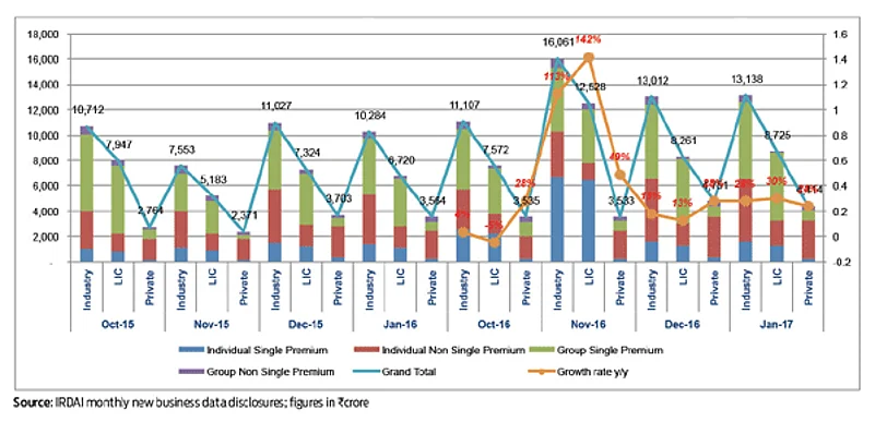 Extensive research by ICRA supports the view that inflows into life insurance products spiked in the aftermath of the note ban. “There was a substantial jump in the new business premium in November 2016. The increase is predominantly in LIC new business figures, and in particular the individual single premium product, indicating a one-time shift in the financial assets of individuals. The reasons can be attributed to demonetisation and new product releases,” explained Karthik Srinivasan, Group Head, Financial Sector Ratings, ICRA.