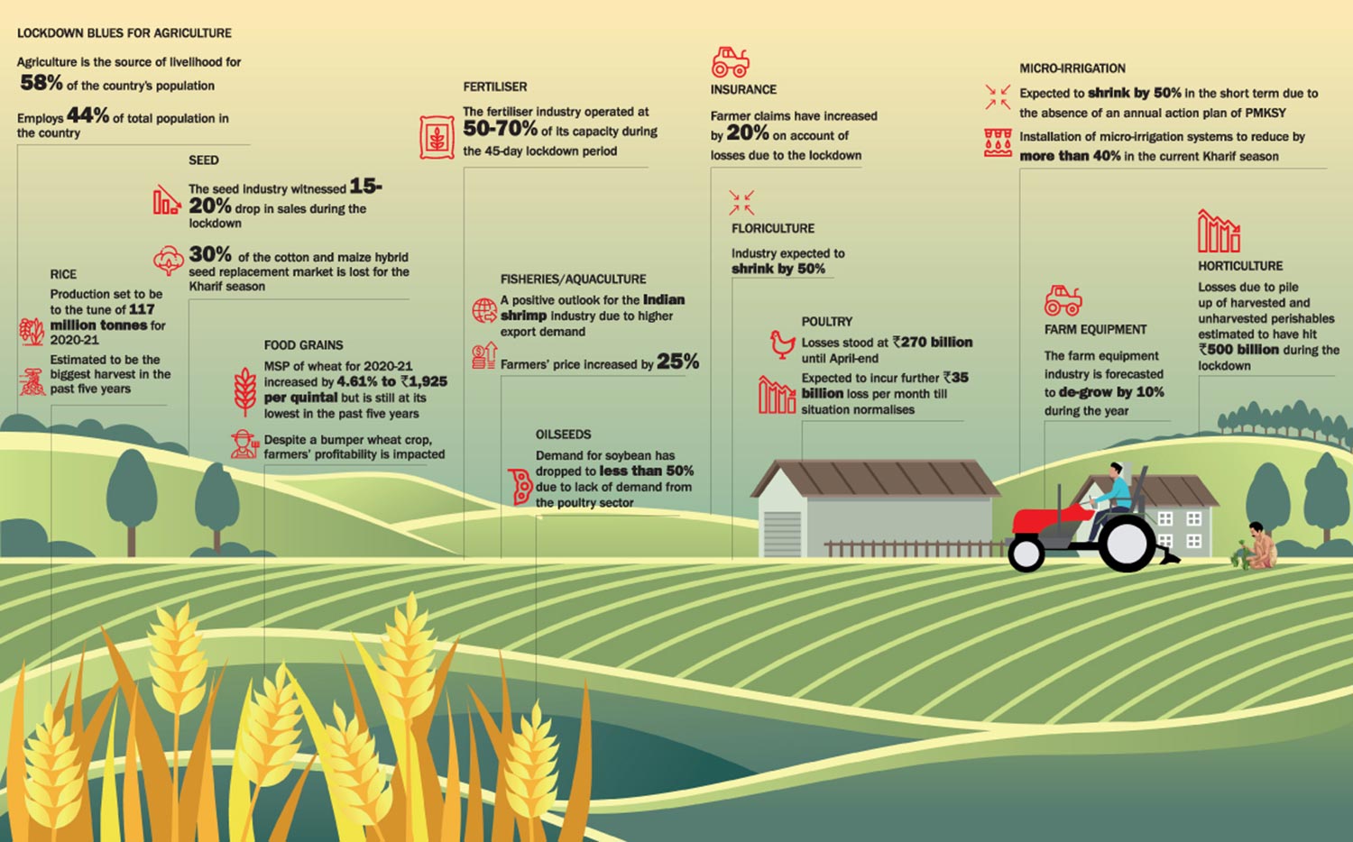 The seed sector, which is worth Rs.287 billion, witnessed 15-20% drop in sales during this period. With lesser seeds to sow, micro-irrigation sector is expected to shrink by 50% in the short-term. Consequently, the farm equipment industry, which is valued at Rs.432 billion, will de-grow by 10% during the year, forecasts the report. Meanwhile, the poultry sector is expected to incur Rs.35 billion loss per month till situation normalises, whereas pile up of harvested and unharvested perishables has already caused farmers losses of Rs.150 billion.