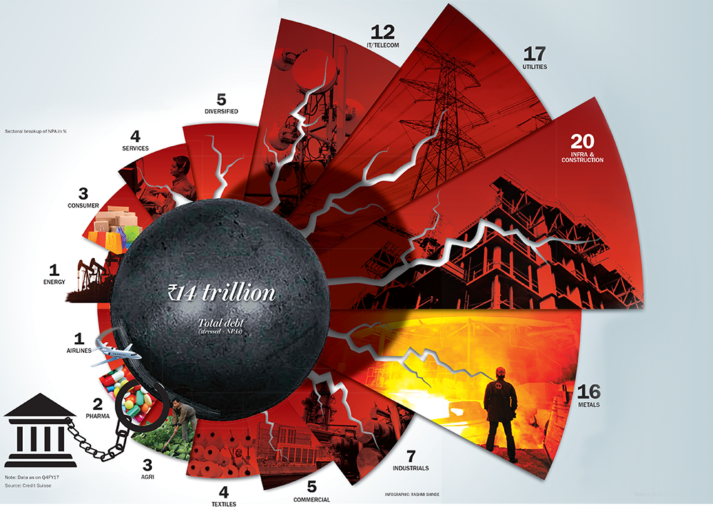 The domestic banking sector’s bad loan kitty continues to swell and now stands at Rs.7.7 trillion, which is 9.6% of total outstanding loans of the banking sector. According to a report by Credit Suisse, the share of power debt with interest coverage of less than 1x has now risen to 70%. Following the entry of Jio, the stress in telecom, too, has increased, with aggregate interest cover falling to 0.3x against 1.5x a year ago. The share of telecom debt with interest coverage less than 1x has increased to 57% or $23 billion. Even though steel prices surged 80% in the just previous fiscal, 55% of debt in the sector continues to have an interest coverage ratio of less than 1x, highlighting the over-leverage. In the power segment, 35,900 MW of thermal and hydropower projects have been declared as stressed assets, with the share utilities in the NPA kitty increasing by 17%. Over the past two years, there has been a decline of bank lending to the infrastructure sector, yet it occupies a chunk of the bad loans at 21% owing to land acquisition problems and cost overruns impacting projects. In other words, Credit Suisse believes that in order to resolve the stress, banks will need to take significant haircuts in the coming days.