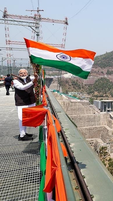 After the inauguration, PM Modi walked across the Chenab Bridge waving the Tiranga, joined by Ashwini Vaishnaw, Manoj Sinha and Omar Abdullah at the ribbon-cutting ceremony.