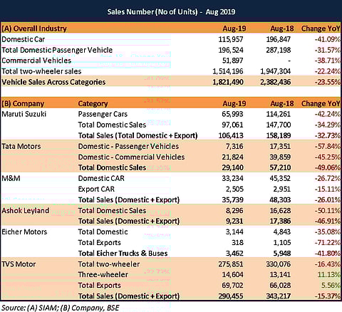Vehicle sales across categories registered a decline of 23.55 per cent year-on-year (YoY) in August 2019, falling for the tenth consecutive month. The following table shows the August sales figures for major auto manufacturers in India, it is clear that the decline is fairly broad based and the magnitude of decline is very high across players. The numbers also show a simultaneous decline in the exports which indicates weak consumer demand overseas too.