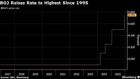 BoJ raised its benchmark rate by 25 basis points to 0.75%, marking the highest level in three decades.