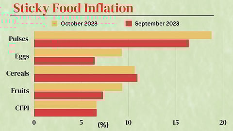 Devendra Kumar Pant, Chief Economist and Senior Director of Public Finance at India Ratings & Research, opines, "Going forward, below par monsoon rainfall is likely to have its impact on cereals inflation, this along with pulses inflation, which increased to 18.79 per cent in October 2023 from 6.62 per cent in May 2023, is expected to keep food inflation elevated."