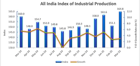 The central government continues to recover the Index of Industrial Production (IIP), which grew by 3% year-on-year in March 2025, according to data released by the Ministry of Statistics and Programmer Implementation. The number showed a recovery from the six-month low of 2.9% recorded in February. In March, the IIP was at 164.8, up from 160.0 a year earlier.