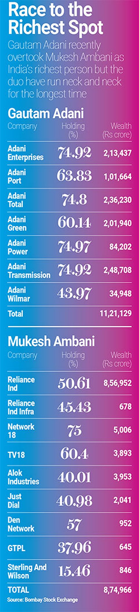 In addition to the bourses being in his favour, the mogul has been on an acquisition spree. In May this year, the Adani Group became the second largest cement maker in the country after it took over the $10.5 billion cement capacity of Swiss giant Holcim in India. He has also announced detailed plans worth $70 billion to harness green energy and produce the cheapest green hydrogen. In July end, the Adani Group had a market cap of over $199.91 billion—or Rs 15,79,289 crore at 79 rupees to a US dollar—and has seven publicly traded companies.
