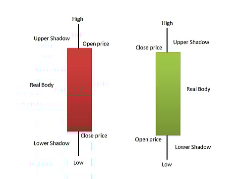 Each candlestick is mainly made up of real bodies and wicks also known as shadows or tails.