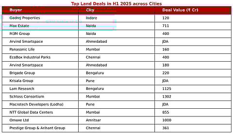 In the first six months of 2025, India witnessed over 2,898 acres of land change hands through 76 deals involving real estate giants like Godrej Properties, Lam Research, Puravankara Limited, Signature Global, M3M Group, Brigade Group, Macrotech Developers (Lodha), Prestige Group, Kolte Patil Developers, Mahindra Lifespaces, and Adani Realty.