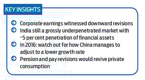 The market entered 2015 with great enthusiasm of improved policy momentum and expectation of economic revival through the year. The government has opted for delayed gratification to invest in structural reforms. India has shifted to fiscal tightening and higher real rates when the rest of the world is happy to prop up asset prices. The economic template has improved, with clearer policies on resource allocation, ease-to-do business, inflation control and incentivising financialisation of assets. The RBI, too, participated with 125 bps cuts through the year and a defined policy mechanism.