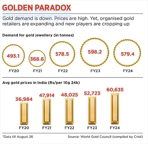 Organised gold jewellery retailers are expected to clock year-on-year revenue growth in the range of 17–19% in 2024–25, according to a report by ratings agency Crisil published in May. “It is the value that migrating from the informal to the formal sector has to offer. The consumer preference for trusted brands and the wedding market demand presents excellent opportunities for growth of branded jewellery retailers,” says Praveen Govindu, partner at Deloitte India, a consultancy.