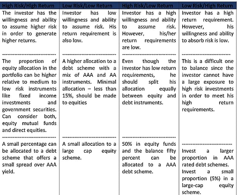Financial markets, whether debt or equity witness ebbs and flows, alternating between periods of positive movements and periods of negative movements. Ideally, every investor would like to build an all-weather portfolio that can weather the shifting dynamics of financial markets. The good thing is that there is a very simple way of achieving this – portfolio diversification through asset allocation. Now, if it is so simple then every individual should have an optimally diversified portfolio that mitigates portfolio volatility and maximises overall return. However, that is not always the case. This is because, an asset allocation strategy should be customised and should reflect the specific risks, return requirements and investment time horizon of the investor. Once the necessary analysis has been done, individuals usually fall into one of the following four buckets: