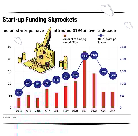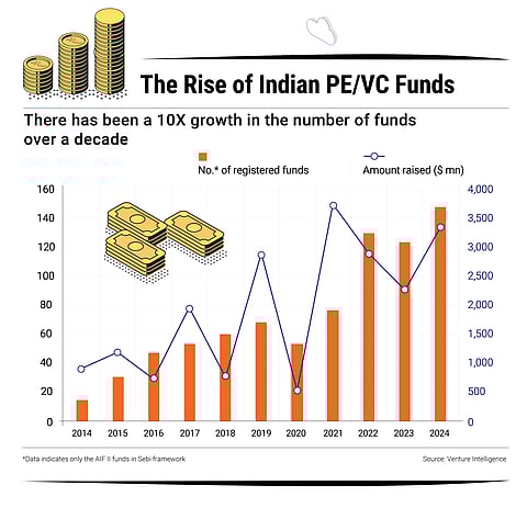 According to data from Venture Intelligence, the number of domestic PE/VC funds has jumped 10-fold over the past decade—from 14 in 2014 to 145 in 2024. For the first time in 2019, the industry raised funds of over $2bn in a year—and that has remained true for every year except 2020 when Covid struck.