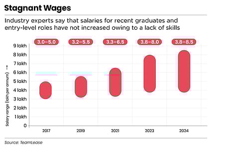Compounding jobseekers’ woes, salaries at IT companies have stagnated. According to TeamLease data, the lower bracket of an average entry-level salary in IT was Rs 3.5 lakh in 2015. In 2024, that number has inched up to Rs 3.8 lakh.