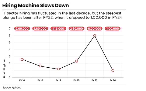 This seismic shift is evident in hiring numbers. Hiring dropped to 95,000 in financial years 2018 and 2021, followed by a sharp rise in 2022, likely on account of pandemic-led digitalisation. But the momentum did not sustain, and in 2023, this number fell to 2,50,000. It further declined to 1,00,000 in 2024, shows data from staffing-platform Xpheno.