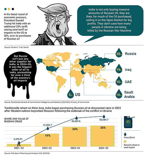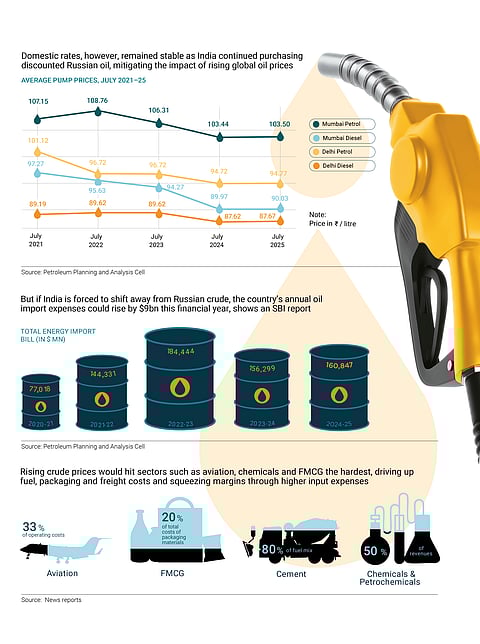 The US tariff hike and oil penalty could threaten India’s discounted Russian crude supplies, risking higher fuel costs and sector-wide inflation