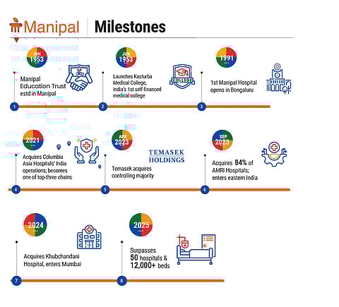 From the 1950s, when Ranjan’s grandfather TMA Pai founded Kasturba Medical College in Manipal, the group was built as a self-financed educational outfit. That began to change in the 1990s when Ranjan’s father opened the first full-fledged private hospital on Old Airport Road in Bengaluru.