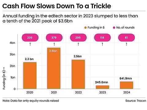Edtechs are trying to adjust to the new reality. But the going has been tough. For instance, the edtech company Physics Wallah, which already operates 120 offline centres, is expanding its network by adding another 30 for the upcoming academic year—a costly affair compared to onboarding users on an online platform. It comes as no surprise then that the company’s loss ballooned from Rs 84 crore in FY23 to Rs 1,131 crore in FY24.