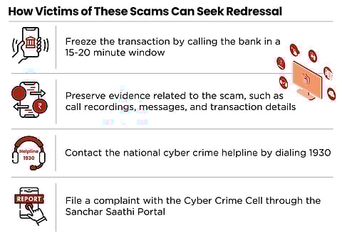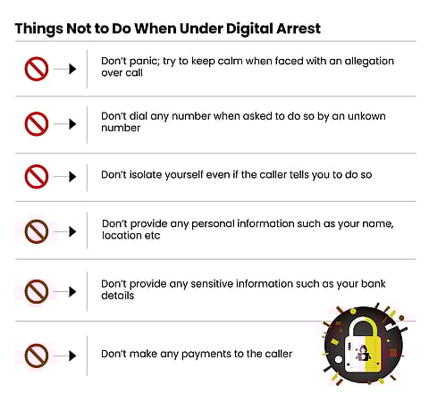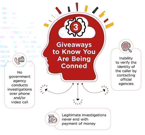 The first step is not to panick, remain calm and not share personal details or account numbers. The second step involves thinking and taking cognisance of the fact that legitimate agencies do not conduct investigation over calls. The third step involves taking action and reporting such incidents to the National Cyber Crime Helpline by dialling 1930 or informing family members and recording evidence.