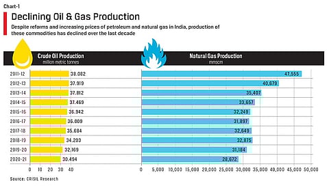 The production in the oil and gas sector has been abysmally low in the past 11 years. While crude oil production from Indian oil fields has declined from 38 mmt (million metric tonnes) to just 30.49 mmt, the production decline of natural gas has been starker in the past decade, falling from the level of 47,555 mmscmd to 28,672 mmscmd. (See chart 1).