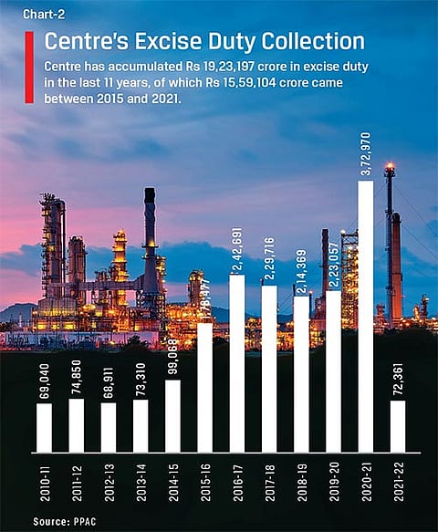 In absolute numbers, the Centre has accumulated Rs 19,23,197 crore in excise duty in the last 11 years of which Rs 15,59,104 crore came between 2015 and 2021. Excise duty from petroleum products contributes 85-90% of all excise collected by the Union government. (See chart 2)
