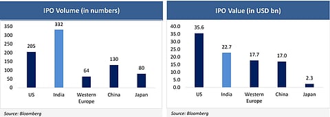 According to the Panthom Group, India leads globally in IPO activity, with 332 IPOs, significantly outpacing the US at 205 and China at 130. Western Europe and Japan trail far behind with 64 and 80 IPOs, respectively.