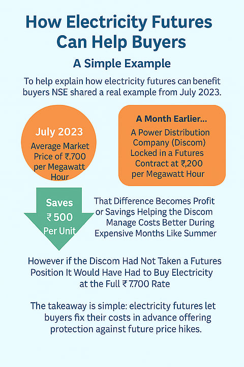 To illustrate how this works in real life, NSE presented a simple example from July 2023. That month, the average spot price for electricity was ₹7,700 per MWh. If a discom had locked in a futures contract earlier at ₹7,200, they would have effectively saved ₹500 per unit, a smart hedge against price spikes during peak demand.