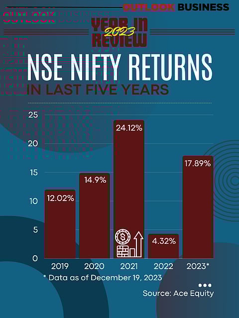 Indian stock markets witnessed a tumultuous journey in the year 2023, marked by several highs and lows, primarily driven by concerns about a looming recession in US, inflation, and impending rate hikes. Markets started the year on weak ground and fell around 7 per cent till March. Post this, it started its rally and surged 26 per cent from the lowest point of March, during the last nine months.