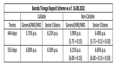 In a press release, BoB said the Baroda Tiranga Deposit would be available in two tenures: 444 days or one year and 79 days, with a 5.75 per cent interest rate, and the other option is for 555 days, with an interest rate of 6 per cent.