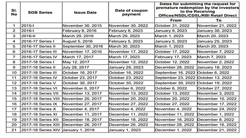 The Reserve Bank of India (RBI) has released dates for the premature withdrawal of Sovereign Gold Bonds (SGB) issued under different tranches. SGBs are available for premature redemption through RBI’s buyback window from the 5th year onwards of the respective bonds.