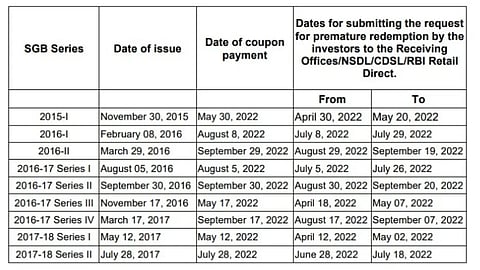 However, the time for premature redemptions has passed for this series. According to the RBI circular, premature redemption orders have to be placed before the interest rate payment of a series. The redemption period for this particular SGB (Series III of SGB 2016-17) was from April 18 till May 7, 2022.