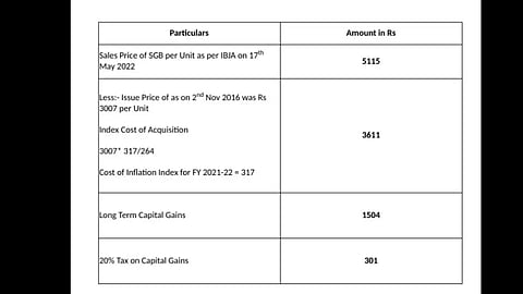 "If someone wishes to redeem this SGB, the LTCG per unit will be Rs 1,504. So, the LTCG tax (20 per cent) would be Rs 301 per unit. Indexation benefit has been calculated on the basis of Cost of Inflation Index taken as 317, which is for FY22. Cost of Inflation Index for FY23 is yet to be notified," explains Deepak Jain, CEO, TaxManager, a tax filing portal.
