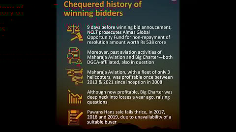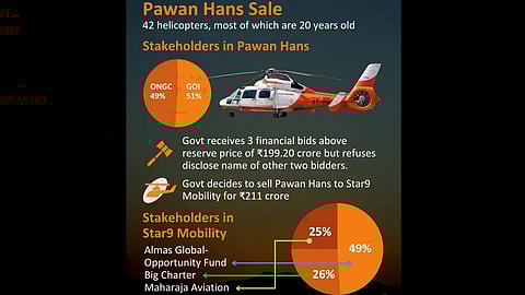 It was a fleeting moment in April this year when the Indian government was able to finalize the sale of its 51 per cent stake in Pawan Hans, after the three failed attempts in the past six years. Pawan Hans is a joint venture by the government of India and the state-owned ONGC which holds a 49 per cent stake in the company. The government had approved the sale of Pawan Hans to Star9 Mobility, a three-way consortium of Cayman Island-based Almas Global Opportunity Fund—a subsidiary of Dubai-based Almas Capital, Mumbai-based Big Charter Private Limited, and Delhi-based Maharaja Aviation Private Limited at a cost of Rs 211 crore, which is above the government’s quoted price of Rs 119 crore. However, an order by the National Company Law Tribunal (NCLT) alleging Almas Global Opportunity Fund of financial discrepancies in a previous bid has forced the government to halt the sale of the helicopter company.