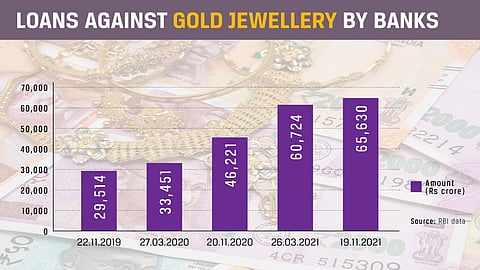The Reserve Bank of India (RBI) data on sectoral deployment of bank credit shows a growing trend in loans against gold jewellery. On November 22, 2019, it was Rs 29,514 crore, which rose to Rs 33,451 crore by March 27, 2020 and stood at Rs 65,630 crore on November 19, 2021.