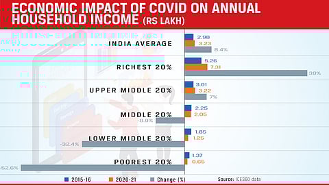 The acute distress in the Indian economy has been caught in the latest ICE360 Survey 2021 of think tank People Research on India’s Consumer Economy. It found that the annual income of India’s poorest 20 per cent households fell by 53 per cent in 2020-21 from their 2015-16 levels. In the same period, the richest 20 per cent of India’s households saw their income grow by 39 per cent.