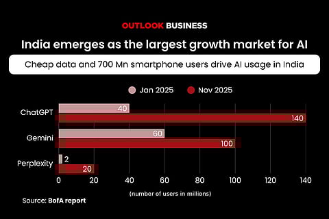 India has become the world’s largest live testing ground for large language models. A Bank of America Global Research report shows that India now leads all markets in active users across major LLM platforms, driven by cheap data, a 700 million plus mobile base, and aggressive bundling by telecom operators.