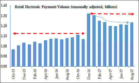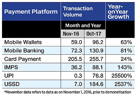 Consider this: As of October 2016, prepaid instruments, primarily mobile wallets, had registered transaction volume of 59 million; exactly a year later, this figure has shot up to 96.2 million, a steep growth of 63%. Mobile banking too followed a similar trajectory as it notched up transaction volumes of 130.9 million during the month compared to 72.3 million in the year ago period. Unified Payments Interface (UPI), touted as the mobile wallet killer at the time of its launch, shot up to 76.8 million from 0.3 as of November 2016 last year. “There is no doubt that it (note ban) has increased the level of the digital economy significantly. Last one year has seen significant growth in usage and adoption of digital channels for making payment transactions,” said Ram Sarvepalli, Partner and National Leader, Advisory Services, EY India.