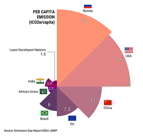 As for India, its emissions have surged with economic progress, yet per capita emissions are only one-third of the global average of 6.6 tCO2.