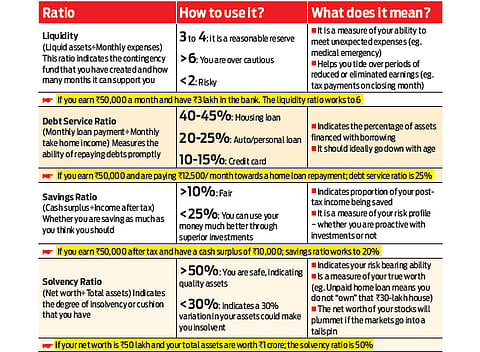 Often, the first real financial lesson is learnt when you realise you have got too much debt with little or no means to pay it off. The three major issues that should concern you are: liquidity to meet emergencies, ability to meet long-term debt obligations such as the 15-year home loan that you have taken, or whether you are saving as much as you think you should. Also, it is important to realise the true worth of your holdings to judge your solvency. Here are some of the ratios that will help you get a fix on your financial status.