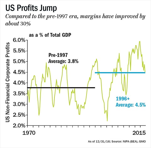 Similarly, earlier, GDP would spike up and then head down, but this time we’ve had it for 20 long years. The average P/E for the 20-year block is higher than that in ‘29, ‘72 and ’87 when it went above 21. And for the entire 20 years, P/E has averaged 23. I mean, that you have to admit is different, but it’s all explained behaviourally by high-profit margins and low inflation. Now you have to explain, why are profit margins so high? Partly, it is low rates and high leverage and perhaps, there are other factors involved, it’s hard to know which mix of factors. My favourite reasoning is that American corporations are provably more monopolistic, their industry concentration has provably gone up a lot, number of companies in existence has actually halved, the number of people employed in new enterprises i.e. one- or two-years-old has halved, so capitalism is on a bit of a down leg, it is not very virile. But monopolies are looking pretty good.
