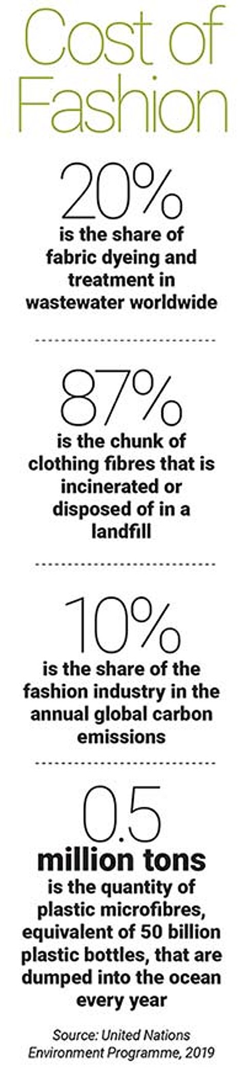 At a time when sustainability has graduated from being a buzzword—even a fashion statement for many—to becoming a serious concern for the planet, the fashion industry is guilty of many sins. It produces 10% of the total global CO2 emissions, or four to five billion tonnes annually, guzzles down 215 trillion litres of water, accounts for 20% of annual wastewater—the list is long and is set to get longer.
