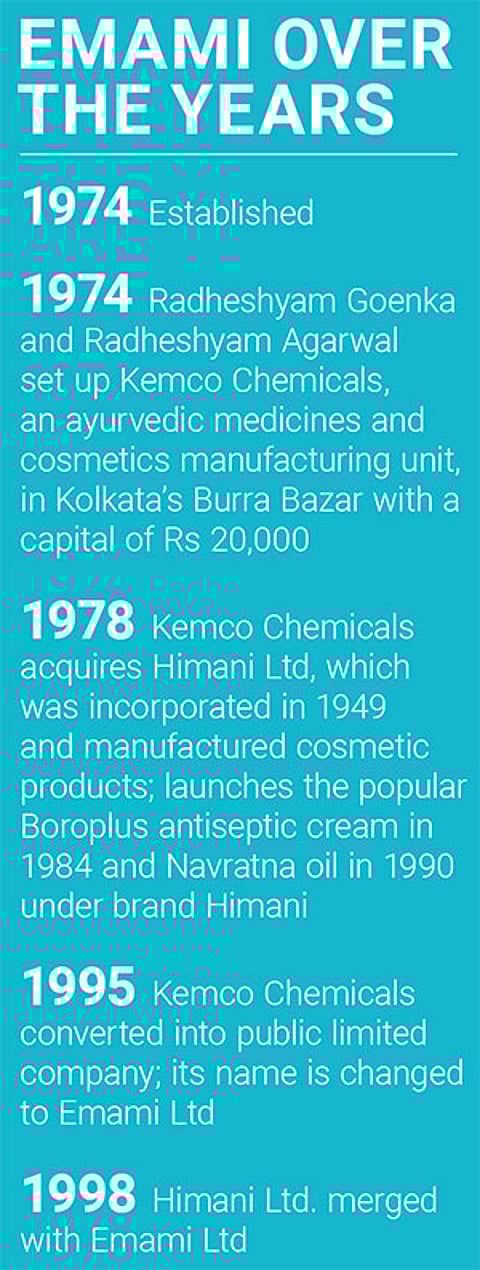 Few can boast of a history as dynamic as that of FMCG major Emami Ltd. It was born half a century ago, in 1974, when friends R.S. Agrawal and R.S. Goenka set up a small manufacturing unit called Kemco Chemicals for ayurvedic medicines and cosmetics in
