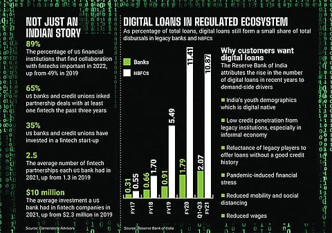 For years, legacy banks have looked at fintechs as unwelcome disruptors in the financial industry. But, this stance seems to be changing now, especially with the rapid rise in electronic payments and digital financial service models. The Covid-19 pandemic accelerated technology adoption in the financial sector. Financial advise company deVere Group has calculated that Europe saw an increase in fintech app usage by 72% after the pandemic. Mobile marketing analytics firm Appsflyer claims that India is the global leader in fintech app installs, seeing 149 crore installs from January 2019 to March 2021. This has opened up the space for tie-ups between traditional lenders and disruptors, with nearly all mid-size and large banks forging partnerships with at least two to three fintechs.