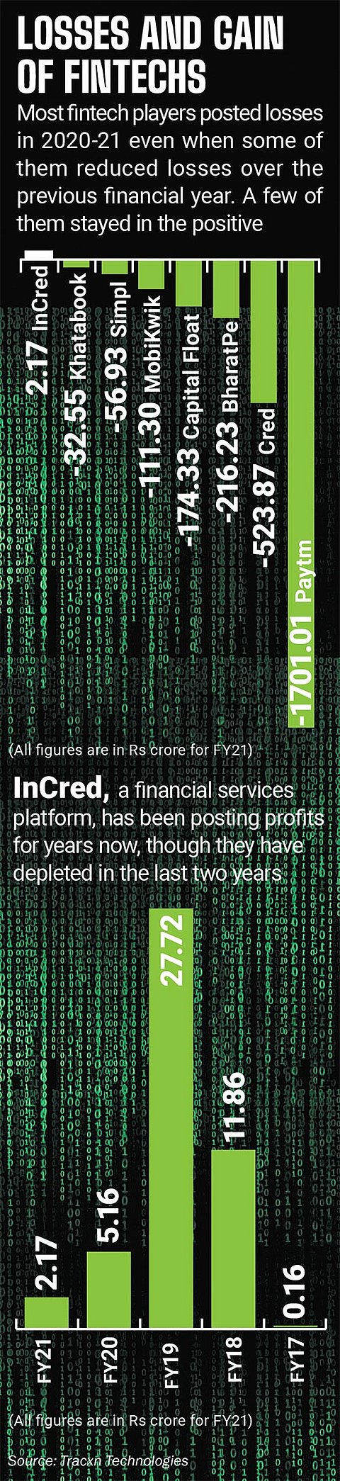 Till such a scenario emerges, the balance sheets of fintech companies, which are a mixed bag, will continue to interest their investors. Paytm, as the market leader, seems to have improved its position over the years. Its losses narrowed to Rs 1,701.01 crore in FY21 from Rs 6,197.30 crore in FY17 as its revenue increased from Rs 780.19 crore in FY17 to Rs 3,187 crore in FY21. On the other hand, BharatPe’s losses nearly doubled to Rs 1,619 crore in FY21 from Rs 912 crore in FY20 while revenue from operations jumped to Rs 119 crore in FY21 from Rs 6 crore in FY20, as per Tofler. Except InCred, whose profits in FY21 increased to Rs 217.03 crore from a profit of Rs 16.58 crore in FY17, major fintech players, like Khatabook, Cred, Simpl, MobiKwik and Capital Float have all reported losses over the years, data from start-up intelligence firm Tracxn Technologies shows.