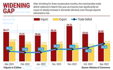 Meanwhile, merchandise imports in March fell 7.9% to $58.11 billion from $63.09 billion for the same month last year. However, after narrowing to a 13-month low of $17.43 billion in February this year, the merchandise trade deficit widened to $19.73 billion in March, as imports, while lower than in the month last year, were higher than in February. While exports are estimated to have increased by less than 14%, imports are up by over 17% against the previous year, thanks to steady domestic demand.